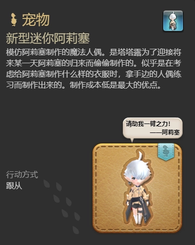 《最终幻想14》里的新型迷你阿莉塞人偶,模样小巧可爱极了。不少玩家好奇,这新型迷你阿莉塞宠物要如何获取呢?获取方式主要有两种,一是使用库洛奖状:铜奖进行交换,二是通过开启特殊配给货箱(重生/苍穹),有几率掉落。下面,就由小编为大家详细介绍《最终幻想14:水晶世界》中新型迷你阿莉塞的获得方法!