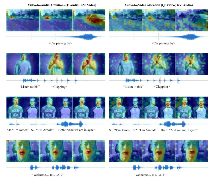 两条流各自采用不同的变分自编码器处理对应的模态。这种解耦方式为特定模态的位置编码提供了支持:针对视频时空结构的三维旋转位置嵌入(RoPE),以及针对音频纯时间维度的一维嵌入。双向交叉注意力层将这两条流连接起来,能够精准地把视觉事件和对应的声音关联起来,例如物体撞击地面的场景。