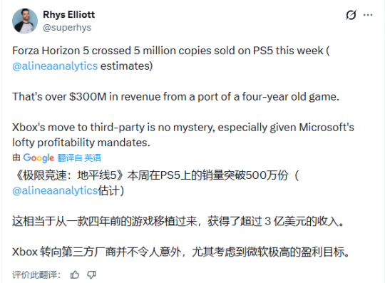 “这表明,一款推出已有四年的游戏通过平台移植实现了超3亿美元的营收,”埃利奥特指出,“Xbox向第三方发行模式转型的意图已十分明确,特别是在微软对高收益有明确追求的背景下。”《极限竞速:地平线5》自上线以来就维持着高热度(首周玩家规模突破1000万),再加上开发团队不断更新内容与功能,它的PS5版本能取得成功并不意外。