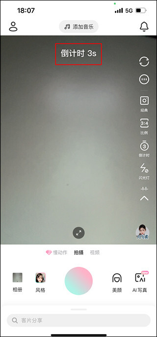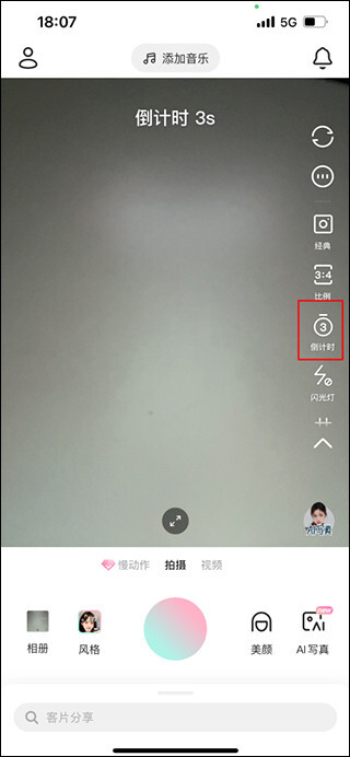 打开轻颜相机应用,进入拍摄界面后,点击页面右侧的“倒计时”图标按钮。