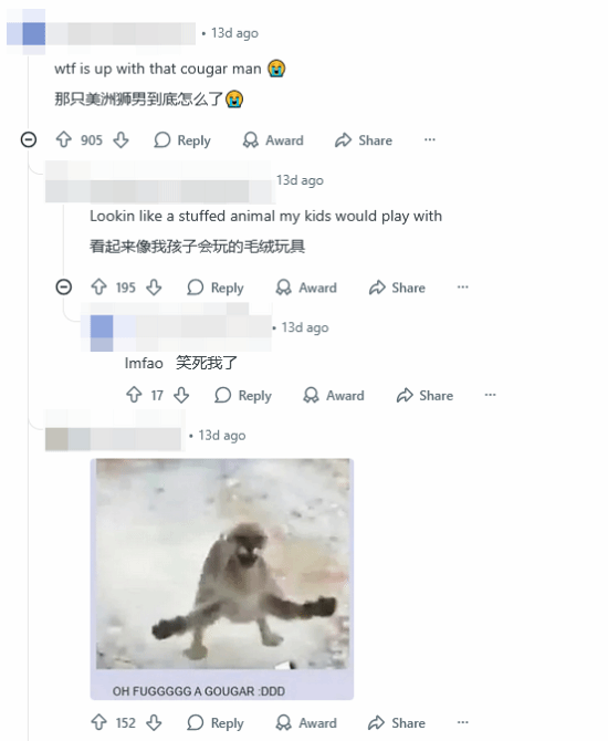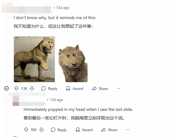 不过,不少玩家都留意到最后一张图片里《给他爱5》中美洲狮的建模稍显抽象,尤其是那双“深邃的眼神”,甚至有玩家晒出世界上第一只狮子标本的照片,以此来调侃它的滑稽感。