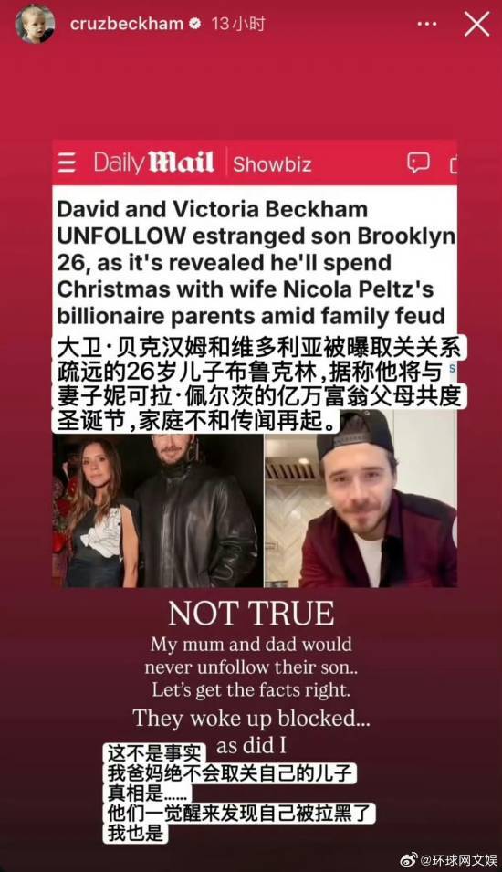 没过多久,就有媒体爆出消息,称布鲁克林与妮可拉当时其实已经抵达英国,然而他们却不愿意参与家庭活动,就连私下见面的请求也遭到了父母的拒绝。紧接着,国外媒体又披露,布鲁克林和妻子前往英国拍摄广告期间,工作地点与父亲所在之处距离极近,但他们依旧没有去看望贝克汉姆。