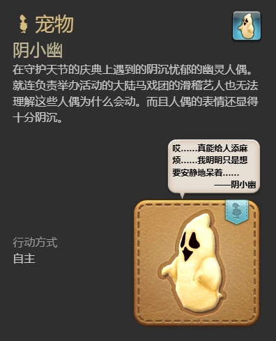 在《最终幻想14》的众多宠物中,阴小幽是其中一员。想必不少玩家都好奇,这个宠物该如何获取呢?其实,获取阴小幽宠物有3种途径,既能够直接购买,也可以通过季节活动的任务以及商店来获取。接下来,就由小编为大家详细介绍《最终幻想14:水晶世界》里阴小幽宠物的获得方法!