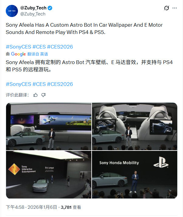 在CES 2026展会上,索尼本田移动公司对外宣布,旗下Afeela 1车型将新增一系列全新的PlayStation功能。这些功能涵盖了定制化的宇宙机器人形象、Gran Turismo车载壁纸,还有主题化的电动马达音效,同时车辆还将内置PlayStation Remote Play功能。驾驶员能够对Afeela的数字驾驶舱进行个性化设置,在宽大的仪表盘屏幕上呈现出带有PlayStation主题风格的视觉效果。