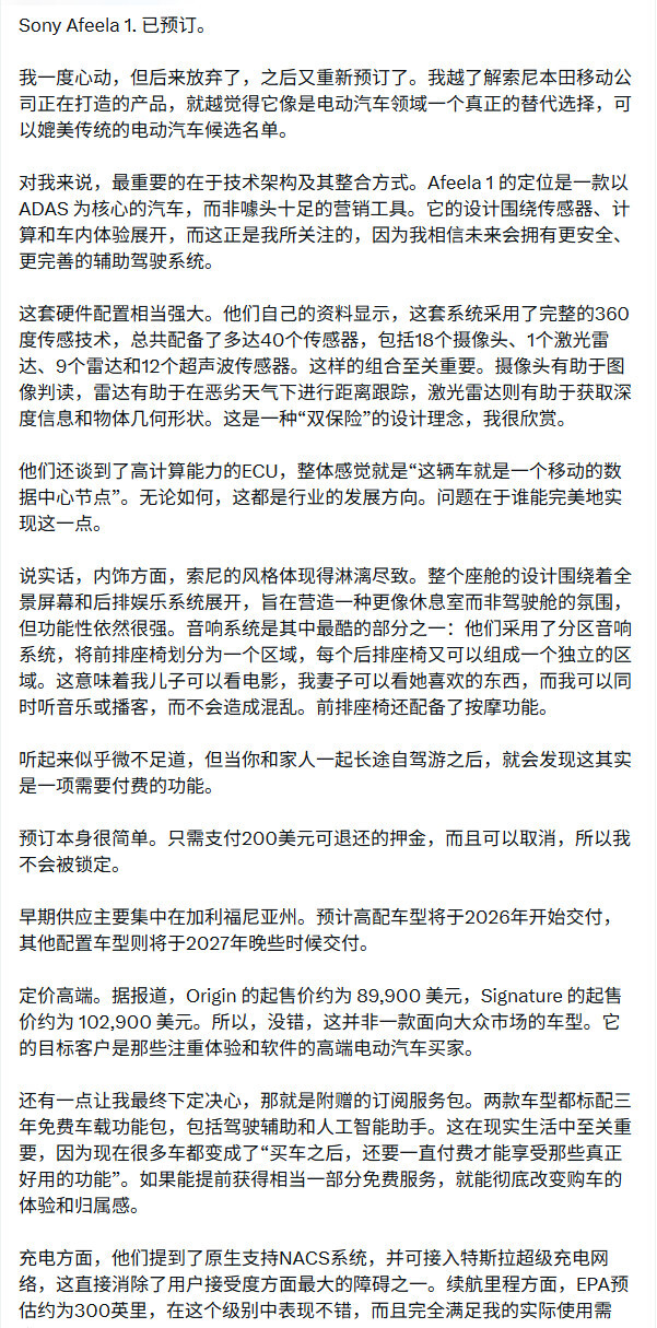 索尼与本田联合打造的Afeela 1计划在2026年底正式上市,其起售价为10万20900美元;而Origin车型则预计于2027年推出,起价为8万9900美元。当下,对这两款车型有购买意向的客户,可通过支付200美元定金的方式进行预订。