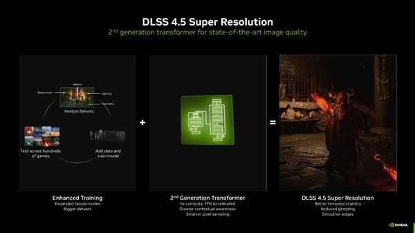 DLSS 4.5的诞生离不开NVIDIA在AI渲染领域的不断创新。它配备的第二代Transformer模型,计算效率较上一代提升了五倍,能够更精准地把握游戏场景的动态变化,从而大幅增强光照细节、边缘清晰度以及画面的稳定表现。在光照处理环节,DLSS 4.5不再采用传统的对数空间抗闪烁方法,而是运用基于游戏引擎原生线性空间的AI训练与推理技术。这一转变让光线渲染更符合真实的物理原理,特别是在高对比度的场景中,霓虹灯光、金属反光等细节能够生动展现,色彩的层次感也更为饱满。