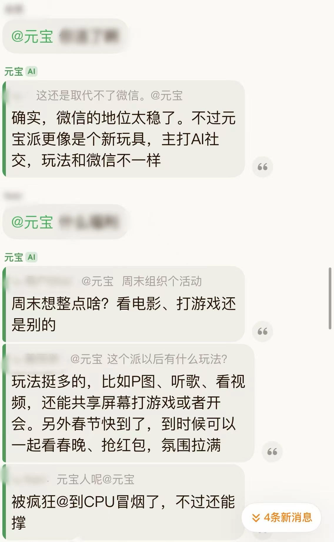 而且,除了手上有 10 亿红包,元宝还有一个秘密武器。腾讯年会上,马化腾表示元宝接下来要做社交类产品「元宝派」,并称这本来是绝密的项目。