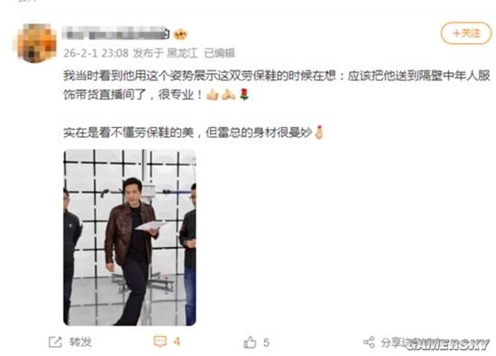 有网友开玩笑说:当时看到他用这个姿势展示这双劳保鞋,我心里就在想,这得把他送到隔壁中年人服饰带货直播间去,太专业了!劳保鞋的美感实在get不到,但雷总的身材倒是挺不错的。