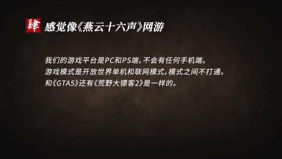 针对游戏风格类似《燕云十六声》的说法,官方回应称:《金庸群侠传》属于PC与PS平台的游戏,暂不考虑登陆移动端;游戏将采用开放世界的单机与联网双模式,且两种模式数据互不互通,这一点与《GTA5》(即《三男一狗》)和《荒野大镖客2》的设计逻辑一致。