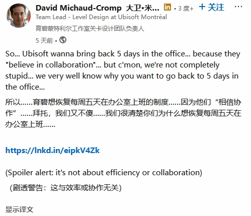 不久后,在育碧任职超13年、现任育碧蒙特利尔工作室关卡设计团队负责人的David Michaud-Cromp,在社交媒体上透露,由于发表了批评返岗政策的言论,他遭到育碧三天的纪律性停职处理,停职期间薪水将被扣除,育碧方面还指控他“涉嫌违反忠诚义务”。