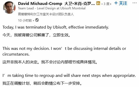 据Insider Gaming消息,David Michaud-Cromp已通过社交媒体发声,称自己已被育碧正式辞退。