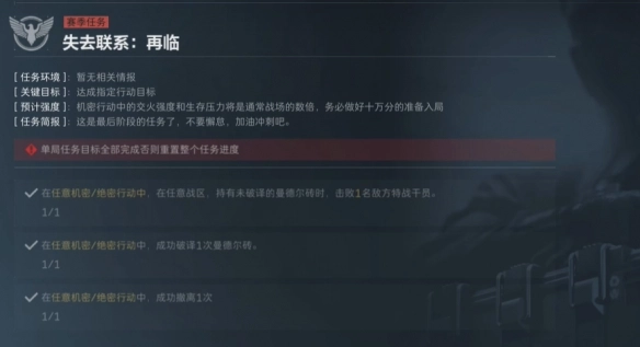 在《三角洲行动》S3赛季里,“失去联系”是获取3x3保险箱的倒数第三个任务。不少玩家可能会疑惑,这个任务究竟该如何完成呢?其实,我们得在同一局游戏中,带着曼德尔砖击杀一名玩家,接着完成破译操作,最后成功撤离,这样才能完成该任务。接下来,就由小编为大家详细介绍《三角洲行动》S3赛季“失去联系”任务的完成方法!