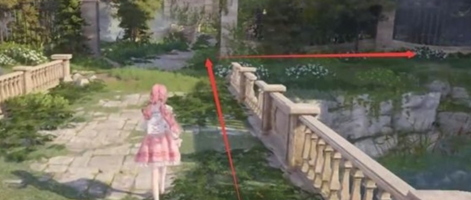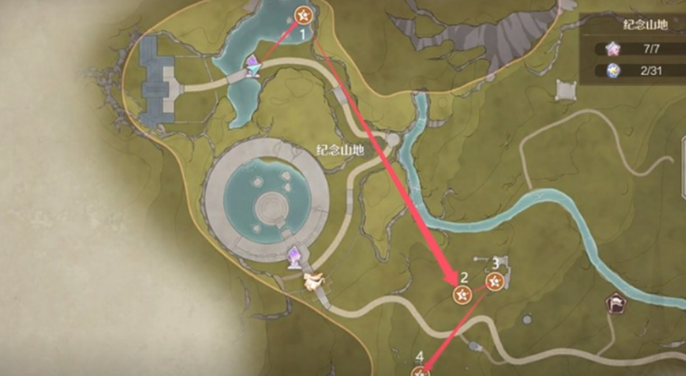 纪念山地主路径后半段。推荐从最近的传送点出发,沿着主路一直前行,切勿转入支路或岔道。此时我们会途经数个岩石与花丛交错的区域,逐步靠近奇想貂的活动范围。