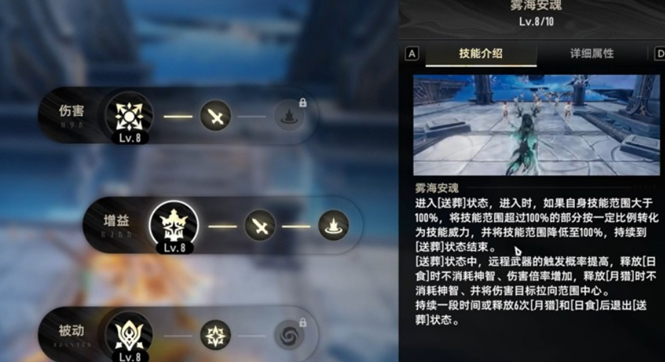 妮弗尔夫人的增益技能“雾海安魂”能让她进入“送葬状态”。在此状态下,她的技能若有超出攻击范围的部分,将得到额外伤害加成,溢出的程度越大,强化效果就越显著。此外,处于该状态时释放技能不会消耗神智,日食的伤害倍率会有所提升,月猎还会附带聚怪效果。