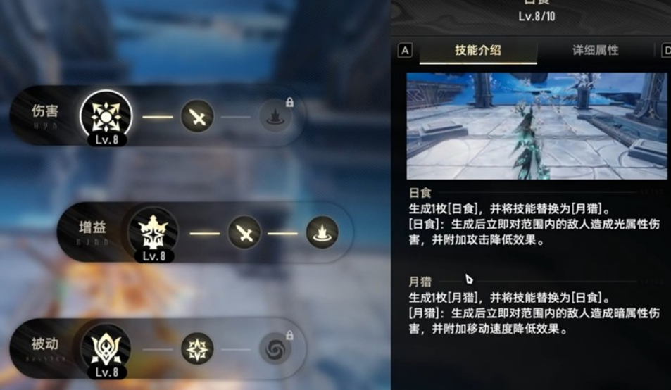 妮弗尔夫人的核心输出技能具备“日食”与“月猎”两种状态,且会在这两种状态之间循环切换:日食