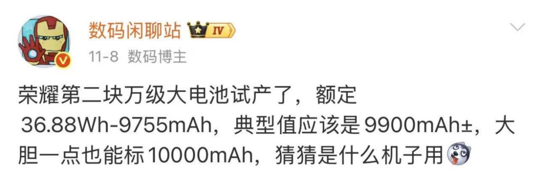 续航始终是影响电竞体验的核心短板,荣耀WIN系列对这一需求的把握显然十分精准。早在11月8日,数码博主@数码闲聊站就曾透露,荣耀正在试产“第二块万级大电池”,其额定容量为36.88Wh(约合9755mAh),典型值能达到9900mAh左右,甚至有可能直接标注为10000mAh。倘若这一“遥遥领先的超长续航”配置应用到WIN系列上,电竞手机的续航局面将被彻底改变。