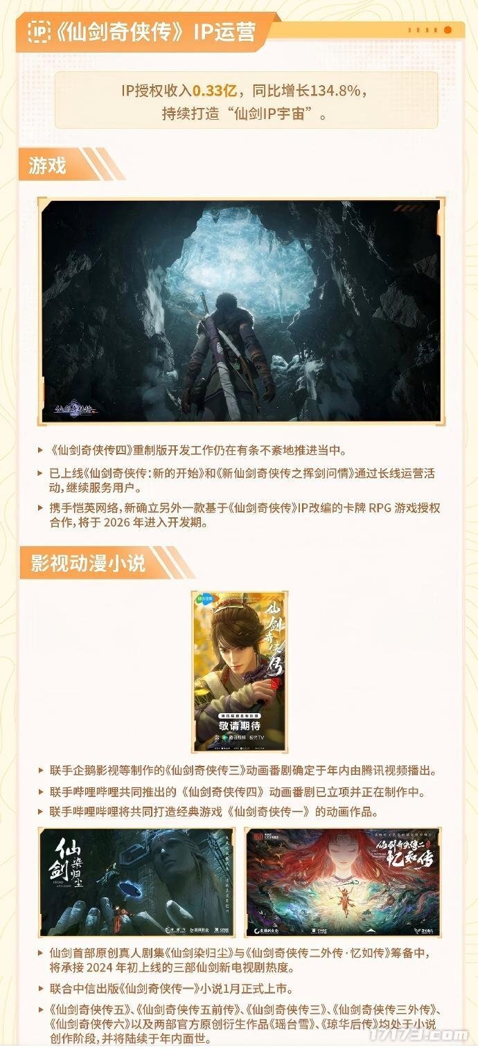 在《仙剑奇侠传》的影视、动漫及小说领域,相关动态如下:《仙剑奇侠传三》动画番剧已确定于今年内在腾讯视频上线播出;《仙剑奇侠传四》动画番剧处于立项后的制作阶段;《仙剑奇侠传一》动画作品将与哔哩哔哩展开合作打造;仙剑系列首部原创真人剧集《仙剑染归尘》以及《仙剑奇侠传二外传·忆如传》正在筹备过程中;与中信出版联合推出的《仙剑奇侠传一》小说已于1月正式发售。