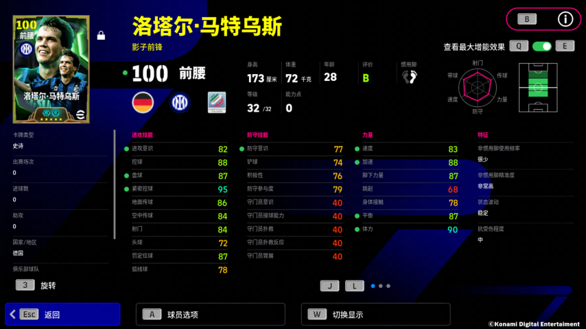 增能属性是【攻守兼备 +2】,这支球队的进攻和防守两端,你都能信赖这位铁血硬汉!马特乌斯另外还拥有特殊技能【无定型传球】,就算处于对手的高压逼抢之中,他依旧可以从容不迫地传出球去!