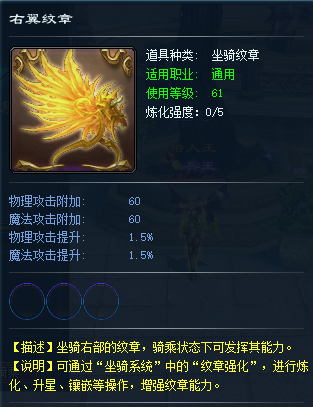 当角色等级提升至61级时,“坐骑纹章”系统也将同步解锁——这是专属于坐骑的装备。角色处于骑乘状态时,纹章能为其带来额外的属性加成。纹章设有前部、后部、中部、左部和右部五个部位,每个部位都具备独特的属性效果。借助炼化与升星操作,还可进一步强化纹章的属性,打造出专属于你的最强坐骑装备!