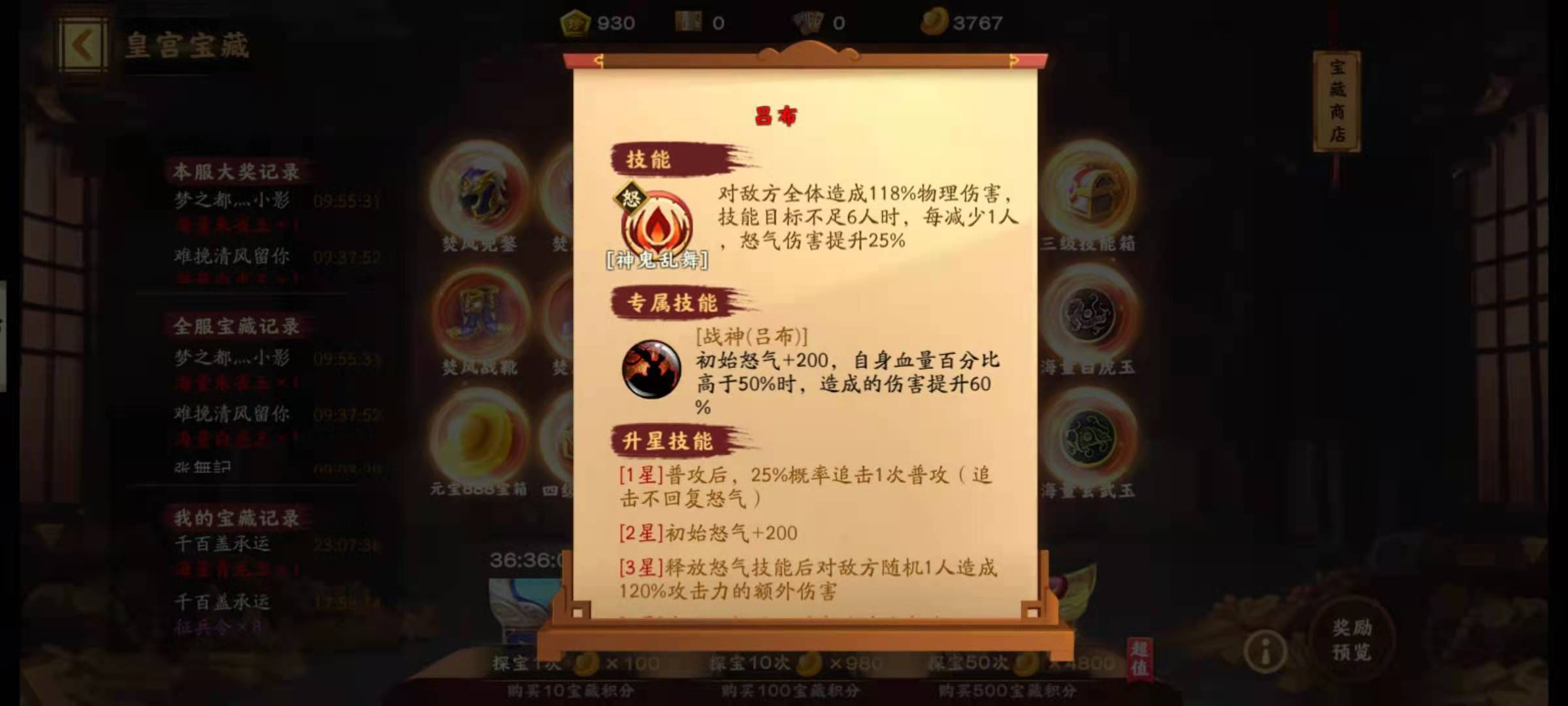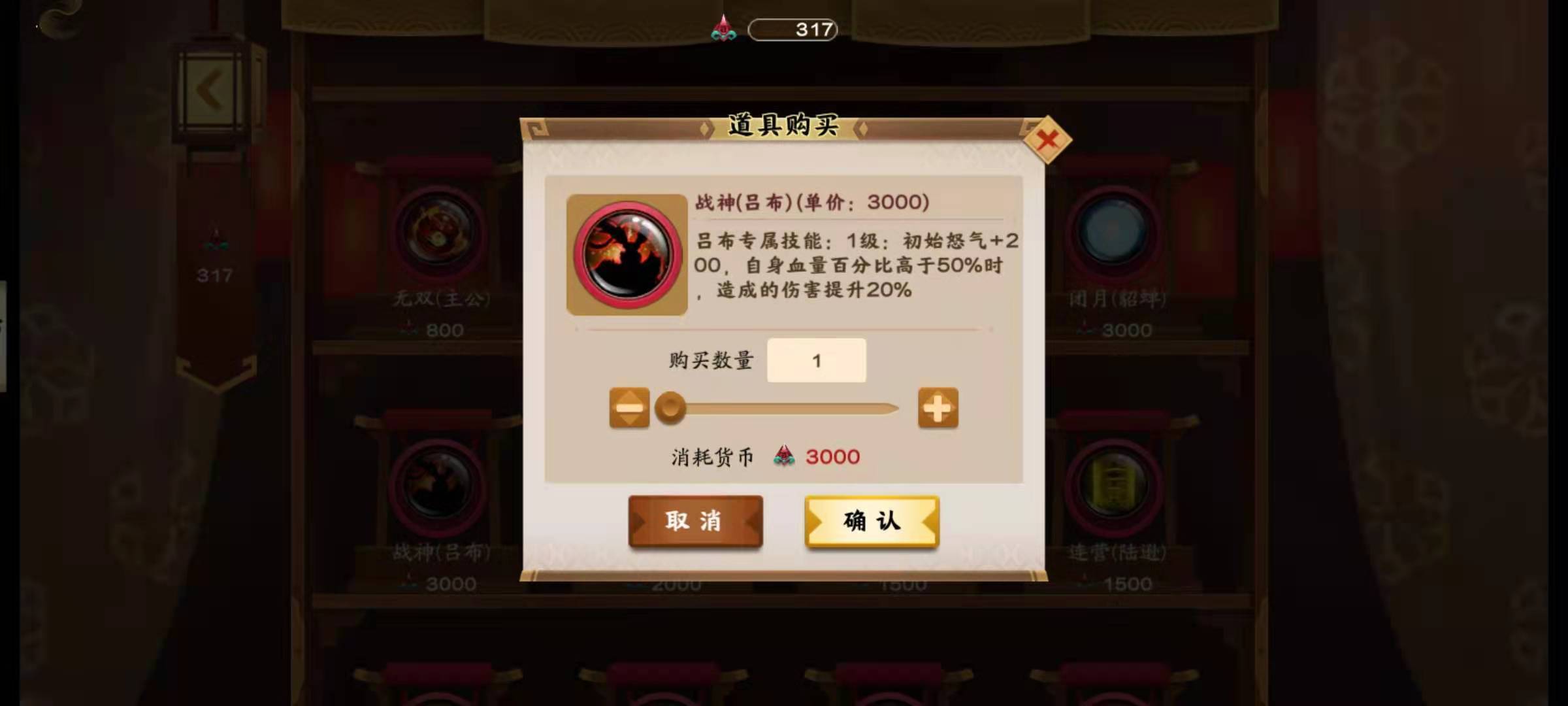 要想把吕布玩得好,武力伤害这块肯定得加强,最理想的技能组合是战神、所向披靡和愈战愈勇。这三个技能里,战神是吕布独有的秘籍,装上之后能激活专属技能,提升他的初始怒气,让他更快放出怒气大招。另外,当吕布血量超过50%时,造成的伤害会提高,也就是说吕布开局就能拿到不错的伤害加成。