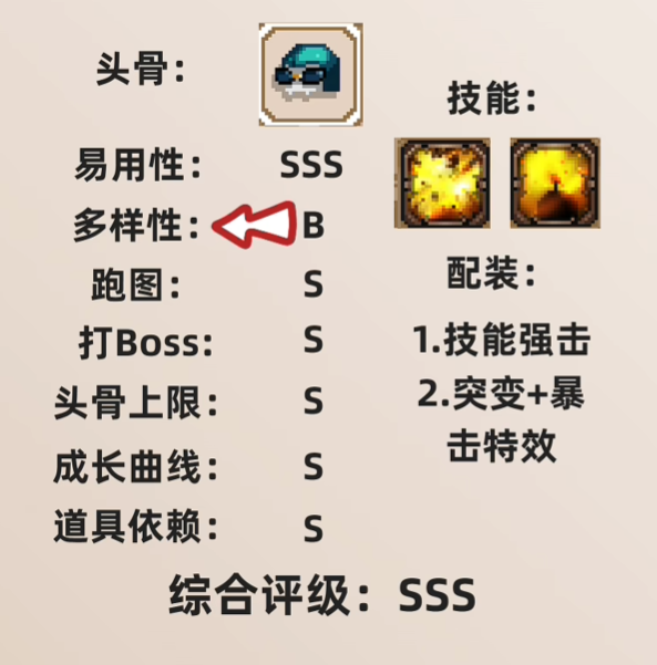 在T1级头骨里,骷髅枪兵凭借高上限的特点,很受操作党玩家青睐,特别是装备出色时,输出能力能和T0级头骨抗衡,对副骨的要求还不低。死神则靠着稳定的强度和快速清小怪的能力在头骨中脱颖而出,但对付BOSS可能稍显费劲。炼金术师以高技能释放频率,搭配秒杀物品形成稳定秒杀流,也成功跻身第二梯队头骨之列。