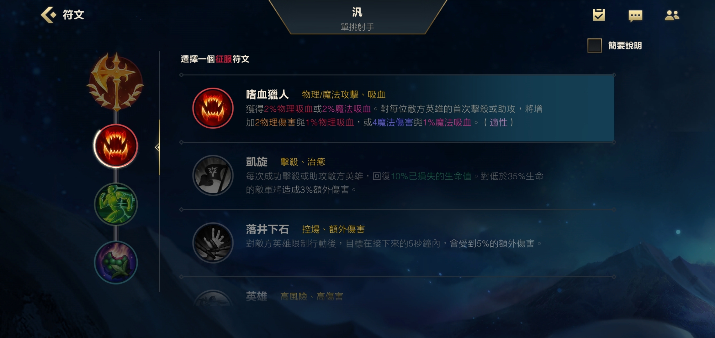 副系天赋里,小伙伴们可以选嗜血猎人。这个天赋能让我们获得2%的物理吸血,而且首次击杀每个敌方英雄时,还能额外拿到2点物理攻击和1%的物理吸血。等把对面五个敌人都击杀过一遍后,物理吸血就能堆到7%了,再配上破败带来的10%物理吸血,咱们的续航回复能力就能达到相当可观的水平。