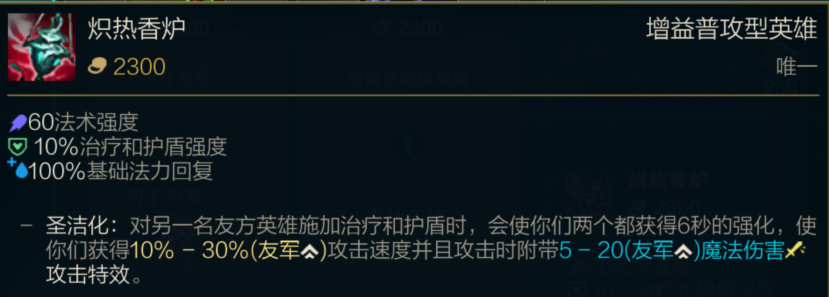 中期出装方面,我们可以选择月石再生器,这件装备能让我们在为队友施加护盾的同时为其回复生命值,大幅增强我们保护队友的能力;CD鞋则能减少技能冷却时间,更短的技能CD有助于为队友创造稳定的输出环境。