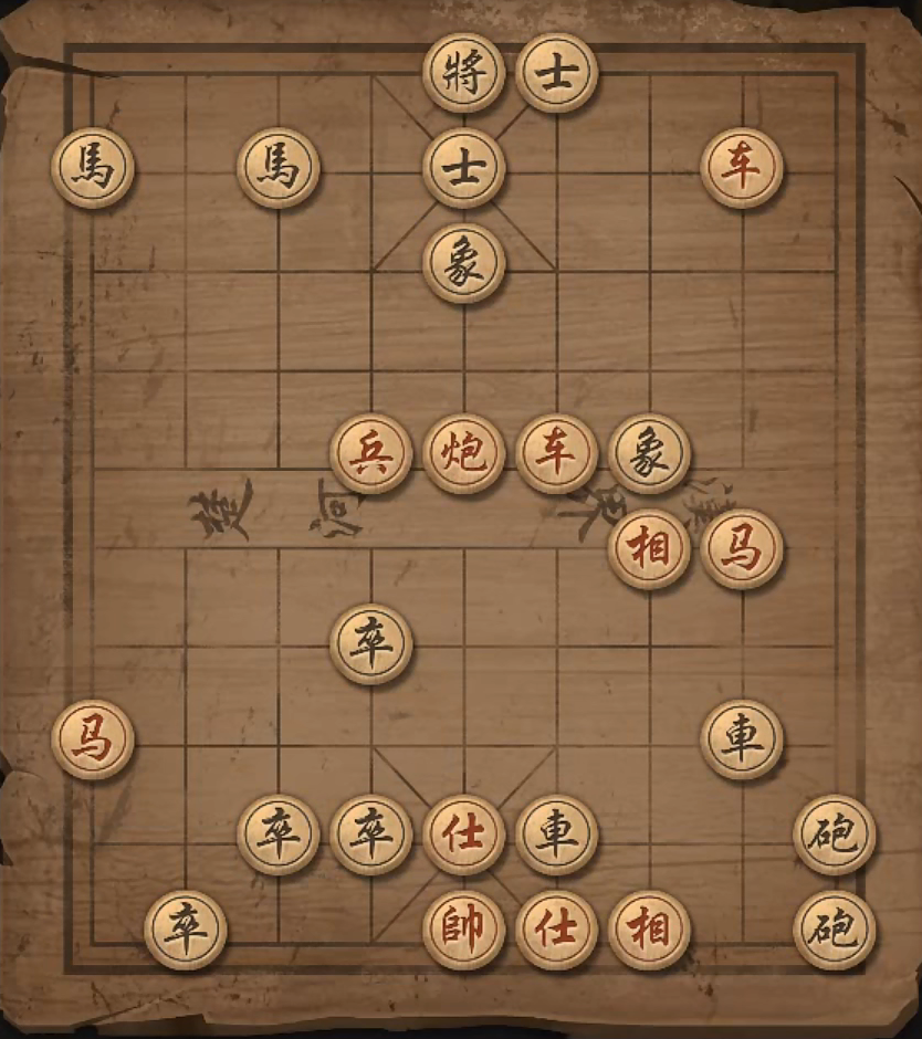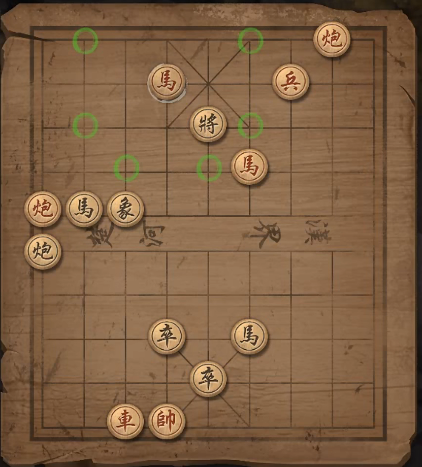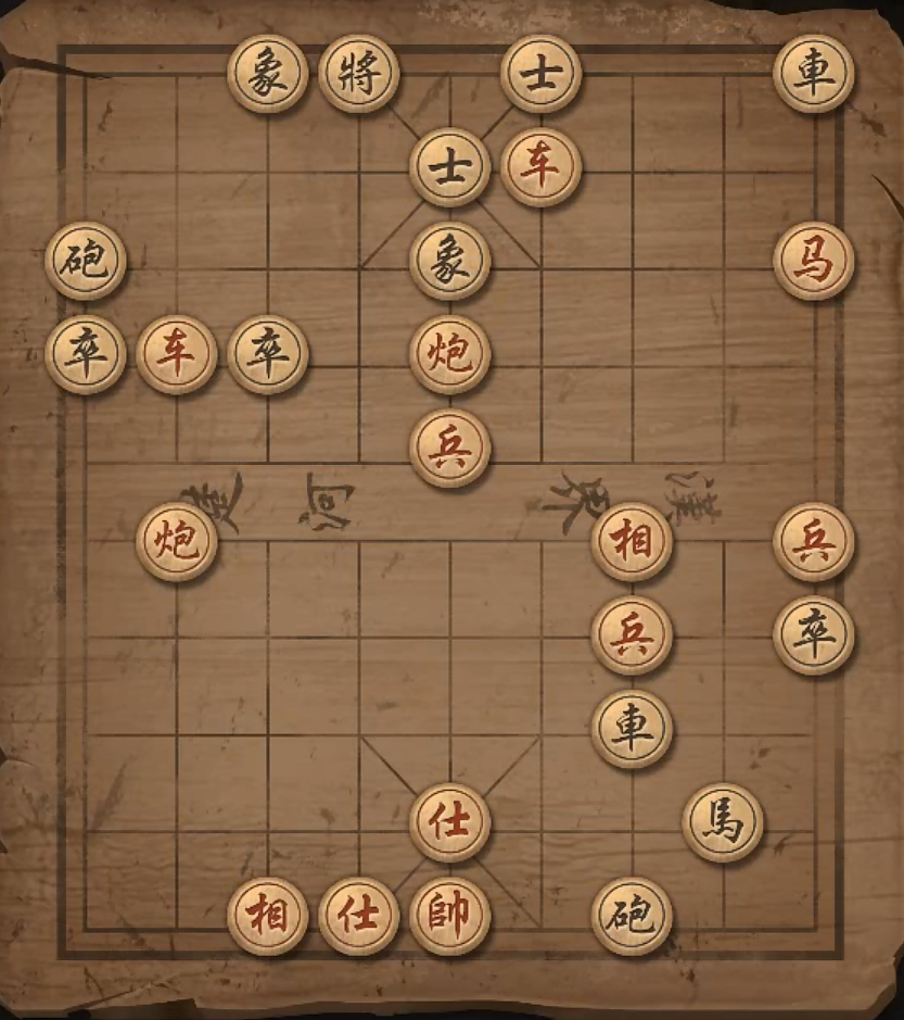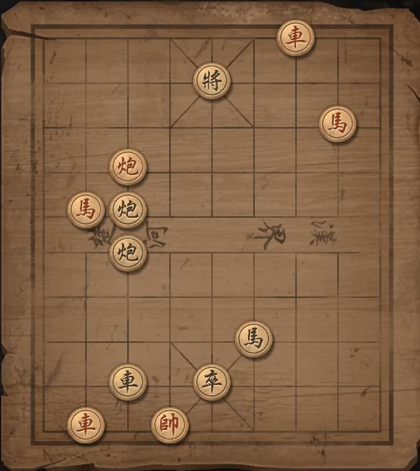 残局一:车5平6,马2退4,马4退5,马5退7,马7进8,炮9进三格,将军。