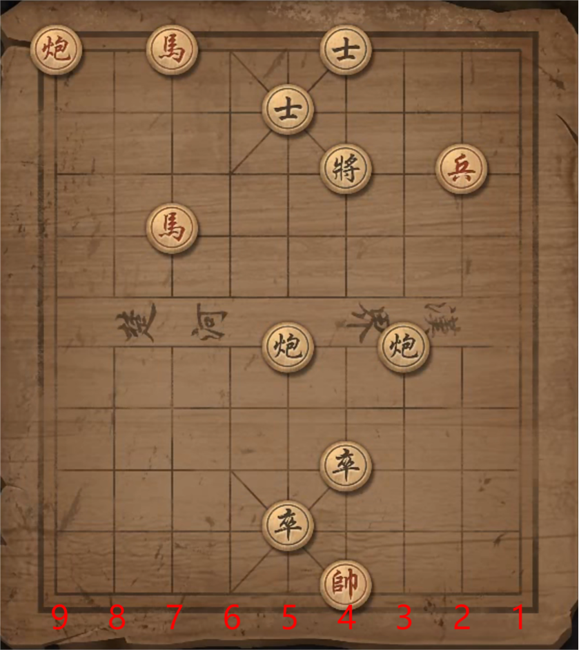 残局五:炮1进四格,兵4进一格,兵4平5,将军。