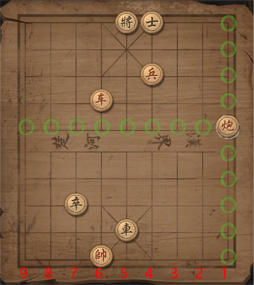 残局十:兵4平5,车2进一格,炮6平5,炮3进8格,炮3退3格,炮3平5,炮5平4,炮5将军。