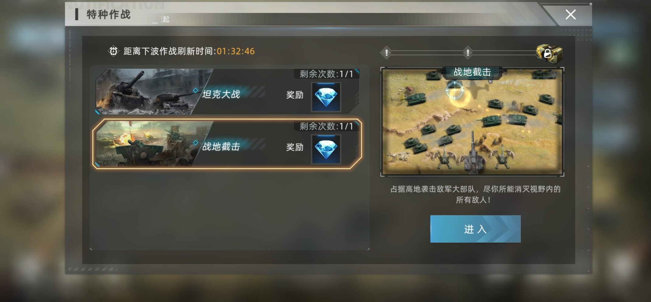 在战地截击关卡里,玩家会占据高地消灭大规模敌人,只需点击屏幕就能对目标区域发起炮击。敌人类型有普通坦克、飞机和主战坦克,消灭排名越靠后的敌人,获得的积分就越多,还能拿到战机培养素材呢~