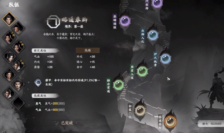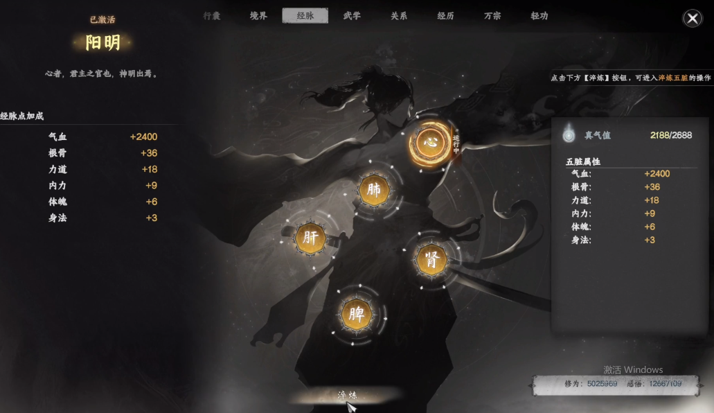 接下来,玩家需打通4条经脉,使内息数值达到35,同时获取两颗不水芸丹·碧,即可晋升至第4个境界——锻体大成。若想进入第5个境界融会贯通,则要让体魄达到60,打通5条经脉,并获得两颗不水芸丹·青。而打通任意6条经脉,将精神素质提升至60,同时消耗三颗不水芸丹·秋,就能进入第6个阶段内气初生。到了第7个阶段,玩家便步入中期阶段,此时只需打通7条经脉,让角色的身法数值达到100,再获得不水芸丹·弥,即可进入炉火纯青之境。