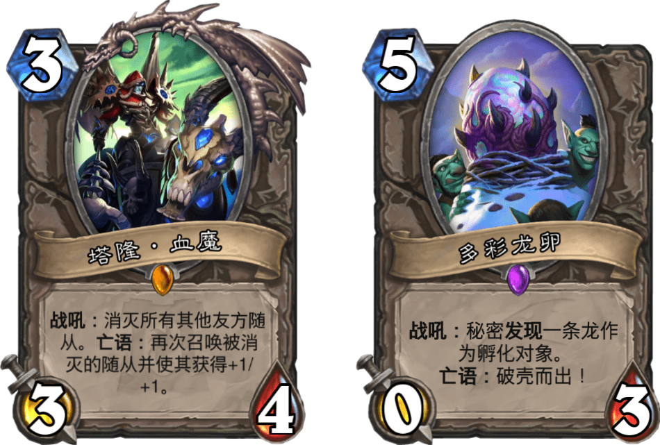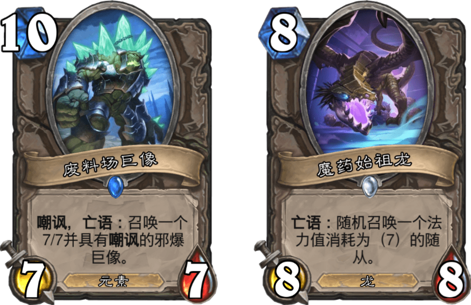 算上炉石传说版本更新已公布的卡牌,标准模式里可用的亡语随从有四十四张。不过,其中一部分直接召唤时亡语会失效,比如塔隆·血魔和多彩龙蛋,其实不太适合与装备搭配。剩下的随从里比较强势的有卡塔图防御者、废料场巨像、魔药始祖龙和新卡暗月坦克等大概10张以上。我个人觉得这些亡语随从的质量和数量基本能撑起亡语猎这套卡组。