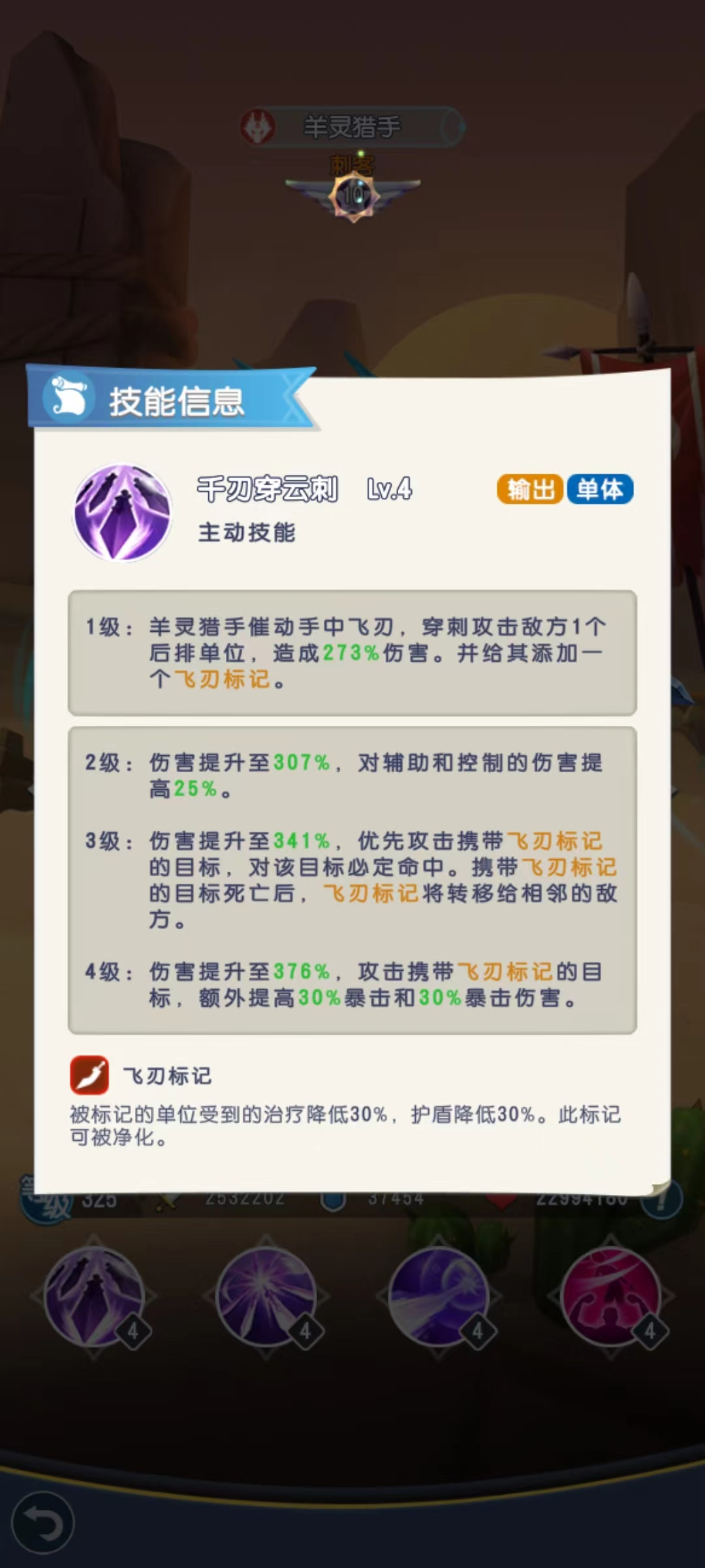 要搭配出一套完整的阵容,第一步得确定核心输出英雄。兽族阵营的核心担当是羊灵猎手,它属于刺客定位,在单体爆发方面表现突出。其主动技能“千刃穿云刺”,能够锁定敌方后排的任意一个目标,打出高额的单体伤害,同时给被攻击的目标附上飞刃标记。随着技能等级的提升,该技能还会进一步增加伤害数值,并且额外获得暴击率与暴击伤害的加成效果。