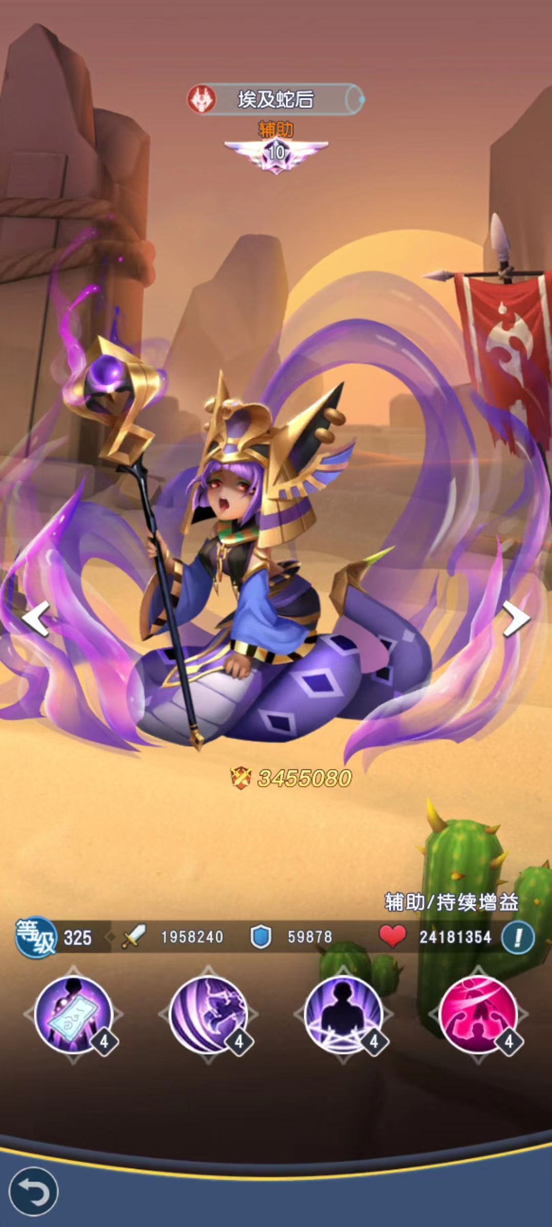 有了羊灵猎手后,其他的搭配就变得十分简单,比如狮子王、大灰狼、雪原巨兽和埃及蛇后。在这些角色里,埃及蛇后是兽族里最顶尖的辅助,她的技能“蛇灵祝福”能给友方血量最低的目标套上护盾,而且技能升级后还会带来额外攻击力加成、清除身上负面状态等效果,能更有效地辅助队友输出。要是全队总血量过低,蛇后还会施展狂花技能,为全体队友清除负面状态。