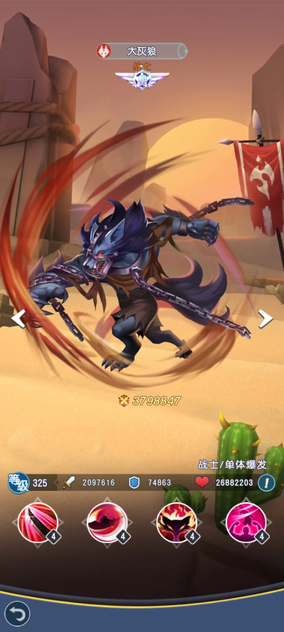 大灰狼的主动技能是凯撒锐爪,用爪子攻击敌方单个目标,若成功将其击杀,自身就能恢复血量。它的被动技能为狼灵狂化,当血量低于60%时会进入狂化状态,狂化后暴击率与暴击伤害都会提升。而雪原巨兽可作为前排坦克,有一定概率让目标陷入冰冻状态,同时自身对冰冻效果免疫,在受到攻击时也有几率进行反击造成伤害。