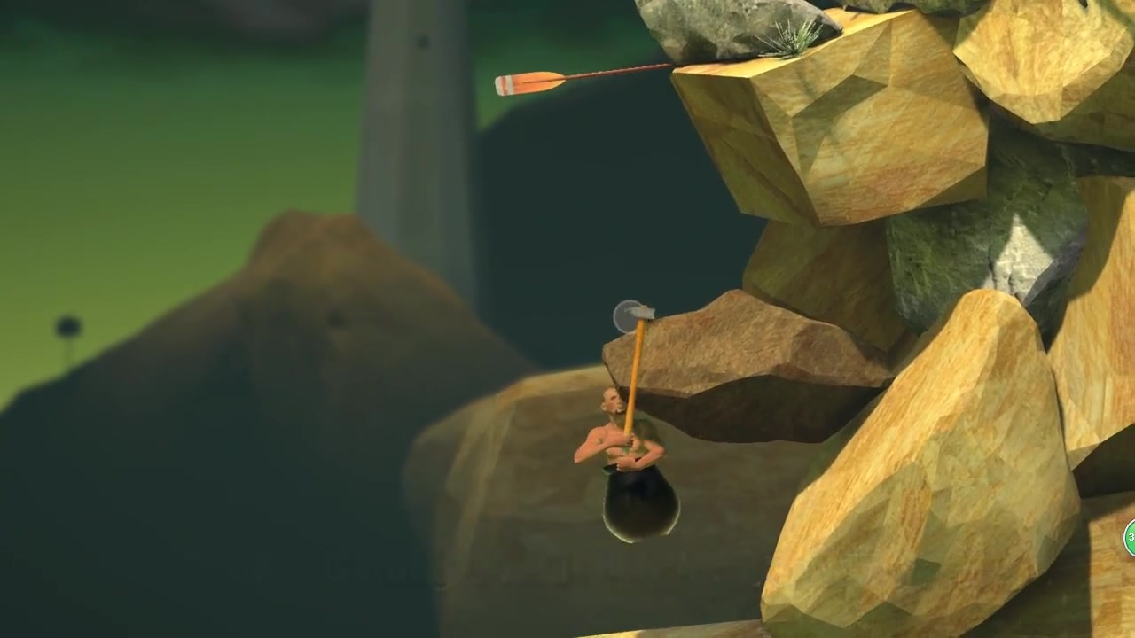 刚进入游戏时,看到主角仅靠一把锤子就要攀登地形复杂的山峰,想必不少玩家在这一阶段就已经打退堂鼓了。不过,若把主角的锤头和身体视为一条直线,通过障碍的方法就会简单很多——只要让这条直线以支点为中心大致画出一个圆形轨迹,就能跨越大部分障碍,而这个圆与上方的交点,就是下一步的落脚点。