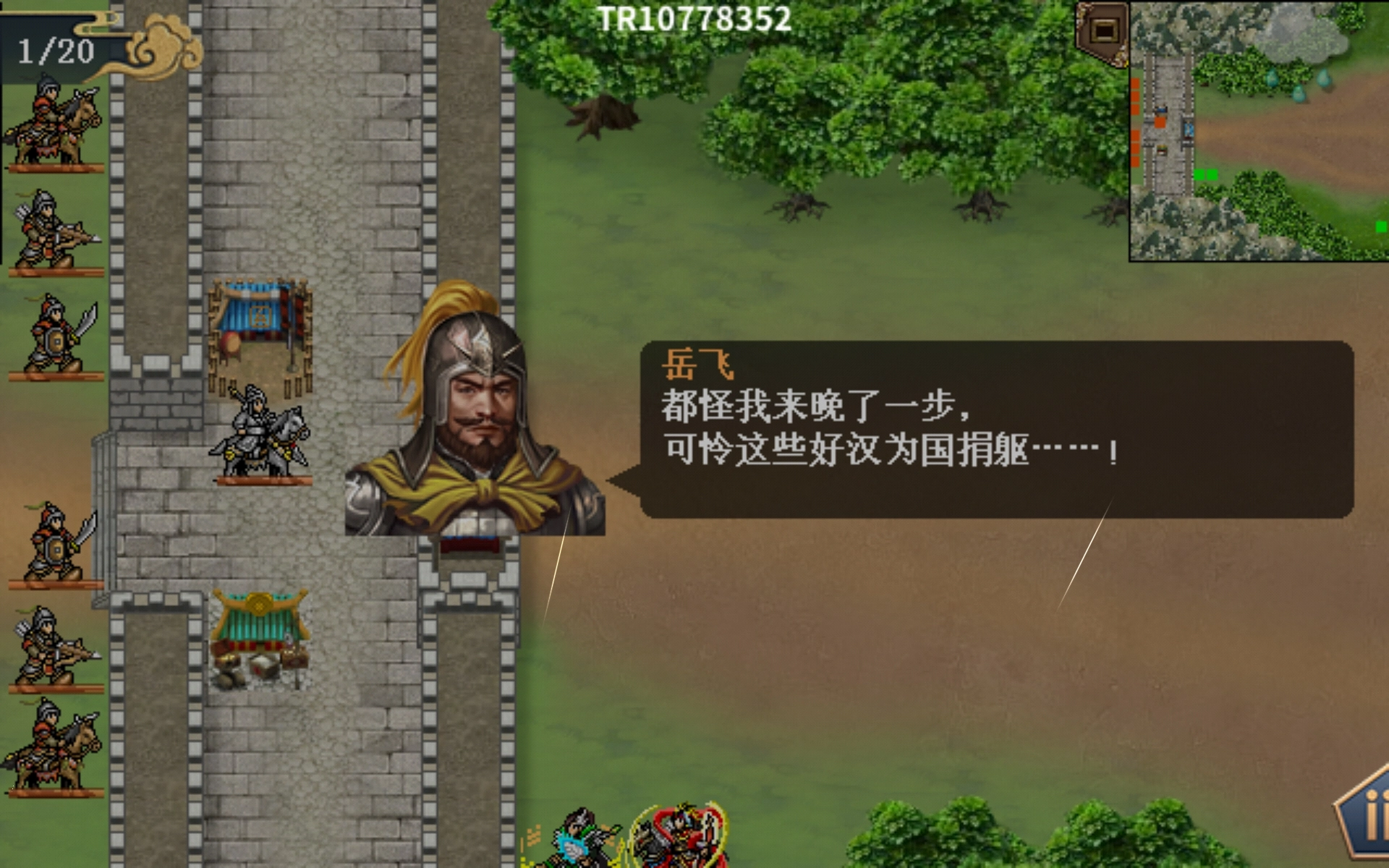 剧情流程:所处地形开阔,没有险要地势可供防守,敌军数量众多。此时,我军选择在原地构建环形防御圈,安排防御能力强的士兵在外围抵挡敌人,以此保护防御圈内的法师和策士,让他们能够安心在圈内施展法术,并对我军进行救援。需要特别留意的是,当金兀术的生命值(hp)小于等于100时,会触发特技“地动山摇”,届时我军全体将士会陷入混乱状态且中毒。所以,必须要在金兀术生命值大于100的时候,将他一举秒杀!这已经是最后一关了,大家全力拼杀吧!
