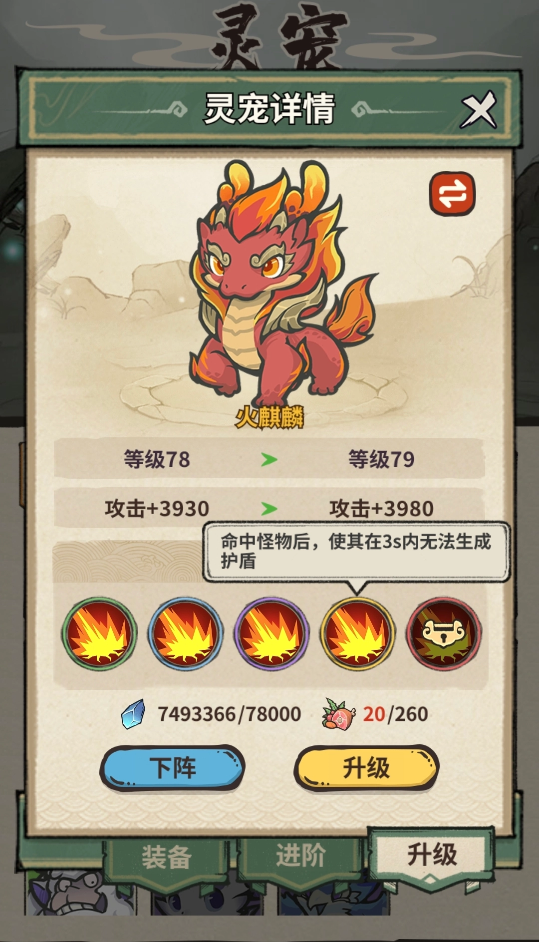 在灵宠当中,火麒麟的重要性首屈一指,无论你玩的是哪个系别,都得设法获取它。火麒麟初始品质为紫色,得为它升星,直至提升到橙色品质。橙色品质能解锁一项核心技能,即“使被命中的怪物在3秒内无法生成护盾”,如此一来,就能避免被那些带有护盾的怪物所困扰。