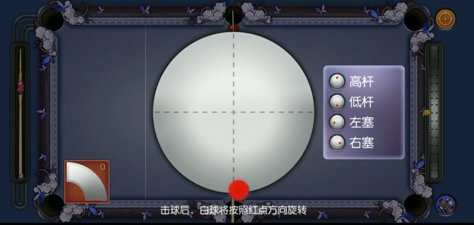 运用高杆击球,使白球前行并实现二次击打,要留意瞄准线需与球中心保持一致。