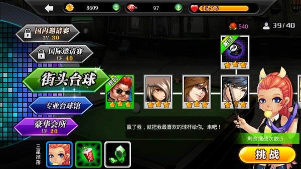 五个会场的挑战难度依次递增。要开启下一个会场,你必须在前一个会场中通关所有关卡,同时人物等级也要达到规定等级。举例来说,若想进入“专业台球馆”,就需要先打通“街头台球”场里的全部关卡,而且人物等级要达到10级(要是不清楚什么是人物等级?嘿嘿!)