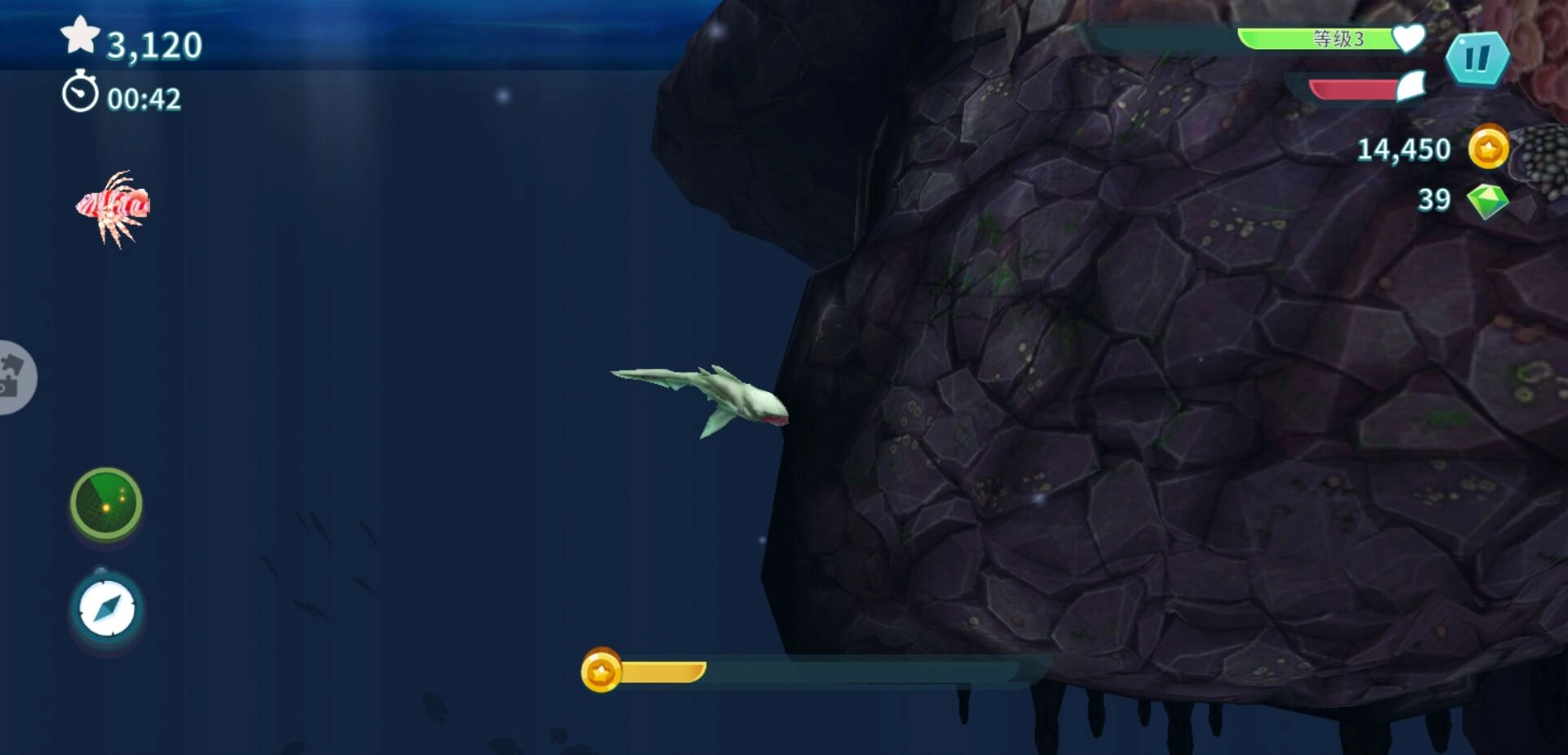 此外,收集金币较多的途径是穿过时空门前往北极。到了那儿,得眼疾手快地吃金币,还得时不时吃企鹅来延长时间。在北极不用担心会被大鲨咬死,毕竟从北极回来后,还能有一段时间继续畅快地吃金币。听别人讲,电鲨10分钟就能收集10000金币。我目前最好的成绩只有4000金币,但这已经是有史以来的最高成绩了,我自己也比较满意。
