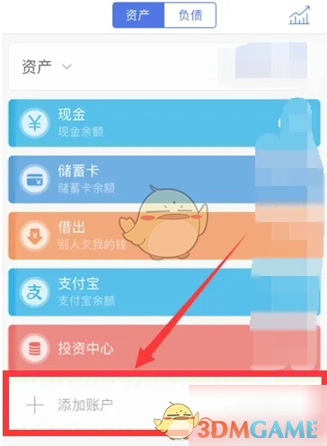 1. 开启口袋记账,点击“添加账户”这一选项,完成操作后呈现的具体情形如下图所示。