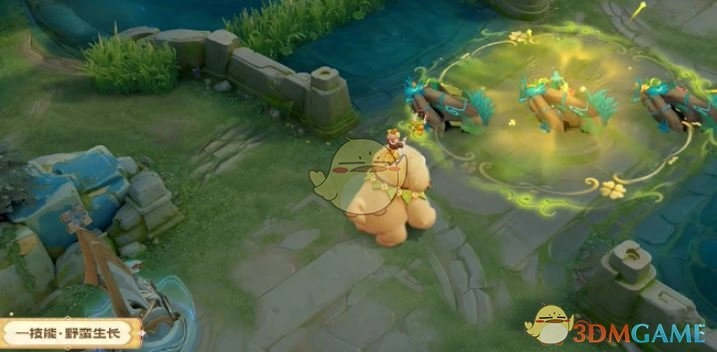 3、一技能“野蛮生长”:释放后,在圆圈范围内会生成三个木堆,若命中敌人,木堆便会转变为三个野怪展开攻击。