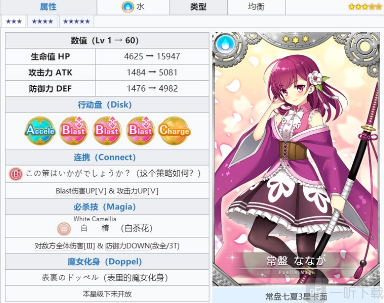 常盘七香属于水属性平衡型角色,战斗前呈现平衡型特点,战斗后转变为攻击型。