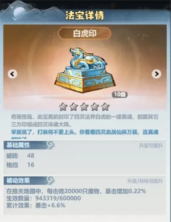 获取途径:大荒冢的法宝探索有概率探索到成品和碎片,但是由于法宝有概率性不能保证必出成品,建议可以在另外一个获取途径商店-超值礼包直接购买白虎印成品