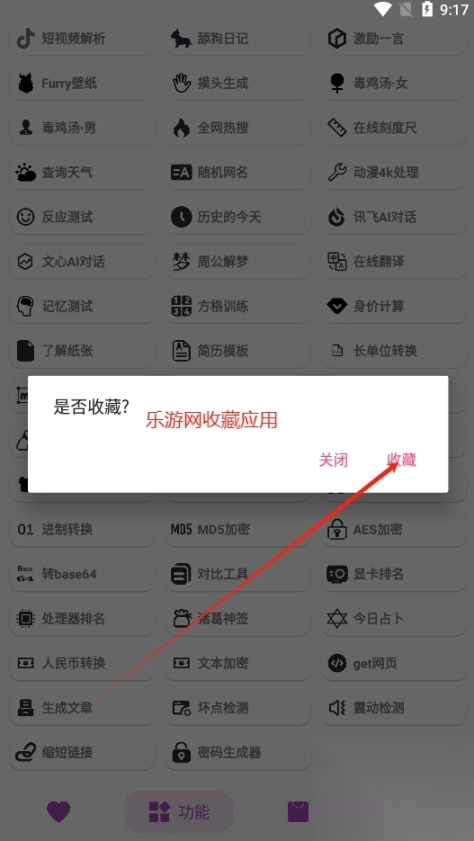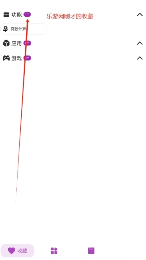 进入软件后,能看到“收藏”页面由功能、应用和游戏这三个主要分类构成。