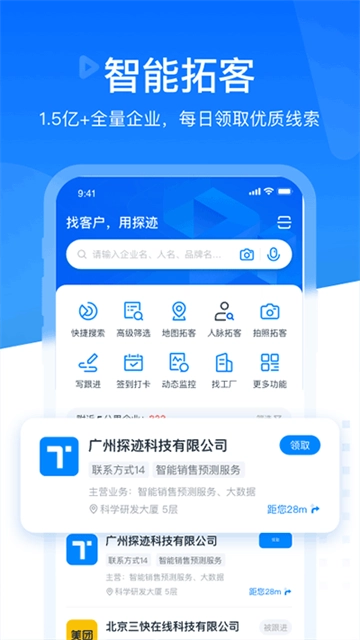 探迹专注于助力销售从业者精准获取业务信息,发掘高价值潜在客户,支持用户灵活记录并跟进订单进展,拓展长期销售订单,从而提升其销售业绩与专业能力。