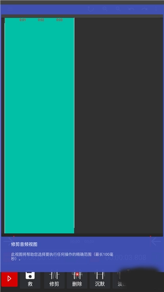 小编这里拿剪辑音频来举例,我们挑选好一段要处理的音频文件打开(也能现场录制),接着就能看到这个文件在音频视图里展开了,在这个视图中可以剪辑音频的长度,最长能达到100毫秒。