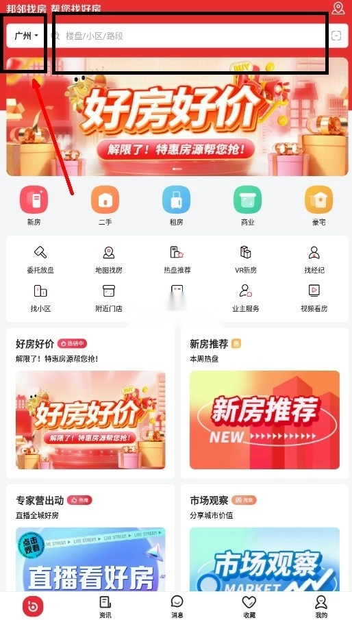 进入系统后,在应用主界面顶部选定目标房源所在的城市,接着输入具体的楼盘名称就能进行查询了。